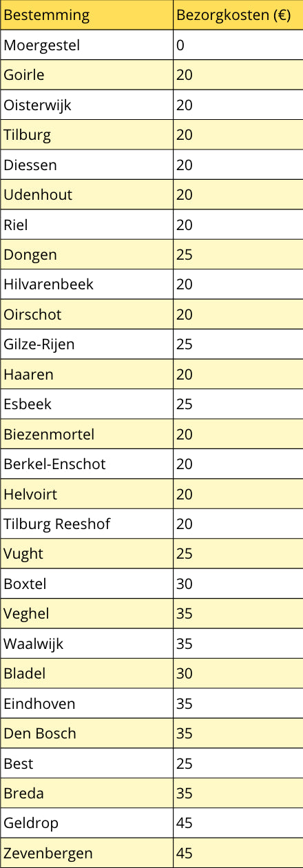 Mocht uw dorp of gemeente er niet tussen staan rekenen wij een vergelijkbare bezorg kosten met een van uw dichtstbijzijnde dorp of stad. Bij een Leverafspraak vermelden wij altijd de precieze kosten.